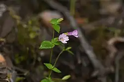 Erythranthe inconspicua is an annual herb producing a thin but elongated and sometimes branching stem up to 30 centimeters long. The leaves are oval in shape, the largest ones up to 4 centimeters long and arranged in a basal rosette, and smaller ones located in pairs along the stem. The tubular throat of the flower is encapsulated in a calyx of sepals which swells as the fruits mature. The pink flower is up to about 1.5 centimeters long and wide, its face divided into five notched lobes.