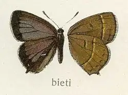 2. ^ Beccaloni, G.; Scoble, M.; Kitching, I.; Simonsen, T.; Robinson, G.; Pitkin, B.; Hine, A.; Lyal, C., eds. (2003). "​Esakiozephyrus bieti​". The Global Lepidoptera Names Index. Natural History Museum. Retrieved April 20, 2018.