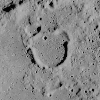 Esclangon is a lunar impact crater that is located in the rugged terrain to the northwest of the prominent crater Macrobius, and east of Sinus Amoris. Its diameter is 15 km. It was named after French astronomer Ernest Esclangon.[1] This formation was previously designated Macrobius L. Just to the west-southwest is the crater Hill. Lacus Bonitatis, the Lake of Good, is located to the east and northeast of Esclangon.