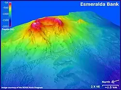 Esmeralda Bank is a submarine volcano around 37 km west of Tinian Island of the Northern Mariana Islands in the Pacific Ocean. It is located at the southern end of the Mariana Arc. It has three summit cones lying along a north–south line. The highest peak is about 43 meters below the sea surface and has a caldera about 3 kilometers wide and several parasitic cones on the edge of the caldera. Sulfur boils and water discoloration have been observed at the site of the volcano, attributed to either eruptions or fumarolic activity.[1][2][3]