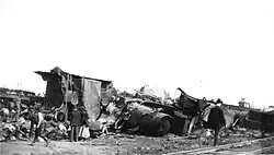 ![]() Makeshift coffins laid out near one of two wrecked steam engines. Burned Pullman cars are to the right. | |