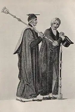 The University of Cambridge historically had a beadle (usher) assisting with official ceremonies as well as being an administrative assistant of the chancellor and the proctors. The title of Gentleman Bedell, similar in status to a Gentleman Usher, was in use by 1392. The title Esquire Bedell was first used in 1473 and formally recognised in the university statutes by Edward VI in 1549.[1]