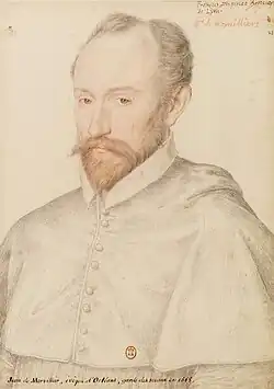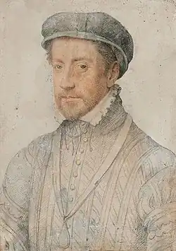 The first deputies arrived at the château de Blois for the coming Estates during November.[37][67] While the meeting would not formally open until 6 December, some began sitting for discussions from 24 November.[69] These discussions were individual to each Estate and it would only be on 6 December that all the Estates were gathered in one place for the first time.[88] On 29 November Henri dispatched two of his councillors, Morvillier and Lansac to treat with the nobility, encouraging them to support his vision in the coming weeks.[89] That same day Blanchefort and other noble deputies were invited to the house of an anonymous prelate, and presented with articles of a ligue to subscribe to, however Blanchefort, of royalist inclinations. refused.[90] The terms shown to the invited deputies proposed an elective monarchy.[91]