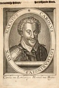 Meanwhile, the Estates began to consider the various candidates for king. There were a considerable number of French princes who held ambitions in that regard. Among them were the duke of Lorraine and his son the marquis du Pont; the duke of Nemours representing the house of Savoie (though the duke of Savoie also had interest); the young duke of Guise, the duke of Mercœur, Mayenne himself and his son the baron d'Aiguillon for the cadet house of Lorraine descended from the first duke of Guise.[28][50] During May, Mayenne also undertook secret negotiations with the nominally royalist Cardinal Bourbon, nephew of the first Cardinal Bourbon about him succeeding his uncle as ligueur king through a marriage to the Infanta.[51] Cardinal Bourbon had not yet received his orders, and it was therefore possible for him to cast them off and become a secular prince.[14] His candidacy was only pushed half heartedly by some involved, who were using it largely to pressure Henri's conversion.[52]
