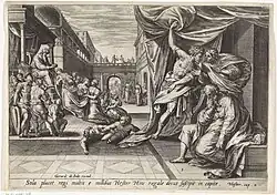 Esther 2 is the second chapter of the Book of Esther in the Hebrew Bible or the Old Testament of the Christian Bible.[1] The author of the book is unknown and modern scholars have established that the final stage of the Hebrew text would have been formed by the second century BCE.[2] Chapters 1 and 2 form the exposition of the book.[3] This chapter introduces Mordecai and his adoptive daughter, Esther, whose beauty won the approval of the king Ahasuerus, and she was crowned the queen of Persia (verse 17).[4] Given information from Mordecai, Esther warned the king of an assassination plan (verses 21–22), so that the would-be assassins were executed on the gallows, and the king owed Mordecai his life.[4]