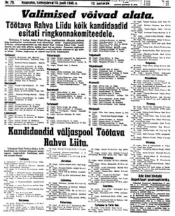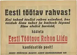 The Estonian Working People's Union (Estonian: Eesti Töötava Rahva Liit) was a front organization of the Communist Party of Estonia (de facto controlled by the Soviet Union and the Communist Party of the Soviet Union) formed to contest in the rigged 1940 Estonian parliamentary election, as the sole officially allowed bloc. It consisted of 22 organizations, including the formally independent Estonian Communist Party, Estonian branch of Komsomol, the Central Union of Estonian Trade Unions and cultural society "Idea". Its platform claimed to unite "democratic strata of the society" and demanded friendship and alliance between Estonia and the USSR, democratic liberties, raising salaries, combatting unemployment, social security, land for the landless, assistance for small farms, lowering the workers' burden of debt, re-organization of personal taxation, free education, ethnic equality, democratization of the military and wide development of national culture. According to official results, 92.8% of voters voted for the bloc, with a voter turnout of 84%.