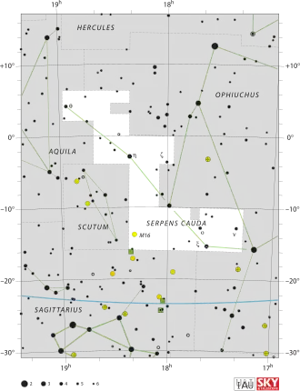Eta Serpentis, Latinized from η Serpentis, is a star in the constellation Serpens. In particular, it lies in Serpens Cauda, the snake's tail. The star has an apparent visual magnitude of 3.260,[2] making it visible to the naked eye. Parallax measurements give a distance estimate of 60.5 light-years (18.5 parsecs) from the Earth.[1]