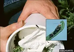 The larvae feed on the roots of Linaria vulgaris, Linaria genistifolia, Linaria pontica, Linaria dalmatica and Anarrhinum bellidifolium.