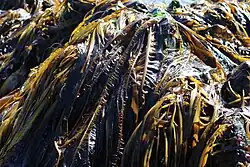 The entire plant consists of a holdfast and a single very large frond or lamina. In one instance, at Anchor Point, Cook Inlet, Alaska, a lamina collected by Griggs and Rigg was 22 meters (72 ft) long by 170 cm (67 in) wide.[2] Other laminae have been measured as wide as 252 cm (99 in)[3] and others as long as 25 m (82 ft)[4] Unusually among kelps, the laminae of Eualaria have midribs.