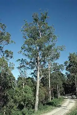 Grey gum usually grows open forest in sites of medium to low fertility such as on dry ridge tops. It occurs in the foothills of coastal ranges near Dungog, Gloucester and Barrington Tops.[3][4][5]