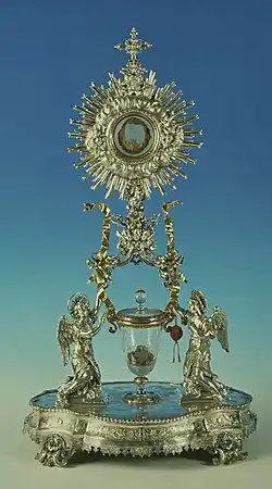 The Basilian monks purportedly kept custody of the Eucharistic elements until their departure in 1175. They were succeeded by Benedictine monks in 1176.[7] The items were placed in different locations within the Church of St. Francis at Lanciano. They were kept in the Valsecca Chapel from 1636 until 1902 when they were relocated to a new altar.[8][9]
