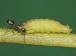 "Of the usual Lycaenid shape .... the head small, black, shining, retractile. Colour of body pale green with darker green or reddish dorsal and subdorsal lines, the latter coalesced into a broad band between the eleventh and last segments. The entire surface of the body covered with minute white tubercles, there are also a few scattered white hairs. The segmental constrictions shallow. Spiracles black. Extensile organs on the twelfth segment small. The larva is broader than high in its higher part, increasing in width to fourth segment, from thence to the flattened anal segment of about uniform width. Bred by me in Calcutta on Phaseolus trilobus. Mr. W. O. Taylor reports that the larva feeds in Orissa on Dolichos catjang, Roxb. Dr. A. Forel identifies the ant in Calcutta as Camponotus rubripes subspecies compressus" (de Niceville.)[3]