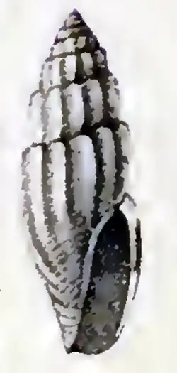 The solid, gradated shell has an ovate shape. It is white with a smoky black spiral dorsal band, most conspicuous just behind the outer lip. It contains 8 whorls, impressed at the suture. The teleoconch shows a few rectilineal ribs, of which 12 in the body whorl. The aperture is narrow and oblong. The outer lip is simple (juvenile). The white columella is rather straight [3]