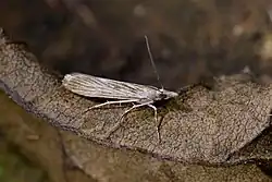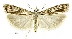 ♂. 23-24 mm. Head and thorax light grey more or less mixed with whitish. Palpi 3, light grey, white towards base beneath. Antennal ciliations 2⁄3. Abdomen pale greyish-ochreous. Forewings elongate, very narrow towards base, gradually dilated posteriorly, apex obtuse, termen slightly rounded, rather oblique; ochreous-grey, usually more or less suffused with whitish on veins, interneural spaces more or less suffusedly sprinkled with dark fuscous; claviform indicated by a small spot of dark-fuscous suffusion : cilia white, with a grey line. Hindwings 1+1⁄4 without long hairs in cell; light grey, paler towards base : cilia white or in one specimen whitish-ochreous, with faint grey line.[3]