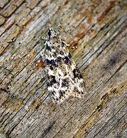 The wingspan is 17–18 mm (0.67–0.71 in). The forewings are white, irregularly blackish-mixed with a black triangular mark from base of costa; lines white, dark-edged, first irregular, second strongly sinuate; an irregular blackish costal blotch beyond first including orbicular and claviform, and a quadrate blotch before second concealing discal spot; terminal area blackish, subterminal line white, touching second in middle. Hindwings are light grey, darker terminally; a darker discal mark. The larva is greenish-yellow; spots, head, and plate of 2 dark bronzy -brown. [1][2]