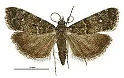 The wingspan is 15–16 mm. The forewings are blackish, irrorated with white. There is a small ochreous-yellow spot near the base, followed by a faint whitish transverse line. Both the first and second line are whitish, margined by dark. The hindwings are fuscous-grey, becoming darker posteriorly. Adults have been recorded on wing in December.[6]