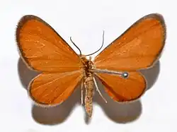 It has a wingspan of 20–24 millimetres (0.79–0.94 in). The wings are bright orange with a narrow black border. Antennae, tarsi and tibiae are black.[1][2]