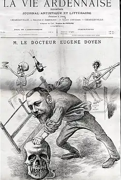 Eugène Doyen studied medicine in Reims and Paris, and later opened a private medical institute in Paris that attracted a wealthy clientele. Doyen was a skilled and innovative physician who introduced several surgical techniques and medical instruments, some of which bear his name today. He was a pioneer in the use of electrosurgery and electrocoagulation, and also marketed a yeast extract he called "mycolysine" for treatment of infectious diseases.
