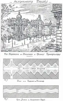 Hénard therefore proposed to replace the monotonous lines of house facades and trees parallel to the road with a "stepped boulevard" (boulevard à redans).[29] In one version, the fronts of the buildings would be at angles to the road and to each other, creating triangular spaces in which trees could be planted.[30] In an alternate arrangement, blocks of trees would alternate with apartment blocks along the road, with the apartment blocks connected further back from the road, thus creating a series of square green spaces along the boulevard.[31] The stepped arrangement would provide a greater amount of light and would provide space for small green spaces between the road and the buildings, or for shops and cafes.[22] Hénard considered that the result would give greater freedom to architects.[32] These concepts influenced the pattern of the linear superblocks in Le Corbusier's famous 1922 Ville Contemporaine proposal.[33]