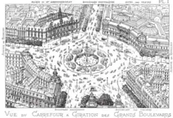 Anticipating growing volumes of traffic, Hénard was in favor of a network of ring roads around the city center linked by arterial roads crossing the city.[42] He presented a project for a nouvelle grande-croisée Est-Ouest de Paris ("new major east-west crossing of Paris") in 1904.[43] In his plan, two broad avenues would intersect at right-angles at the Palais-Royal, dividing Paris into four districts.[44] They would join in a roundabout, cutting into the west side of the Palais-Royal.[25]