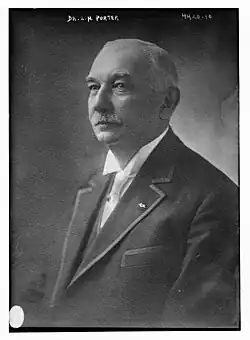 Porter was consulting physician to the Laura Franklin Free Hospital for Children and the Hahnemann Hospital, a Medical Examiner for the Manhattan Life Insurance Company and Penn Mutual, and Professor of Medical Chemistry and Sanitary Science. He resided in New York City. In 1905, Governor Frank W. Higgins appointed him Commissioner of the New York State Department of Health. Governor Charles Evans Hughes reappointed him to the office in 1909. As Commissioner, he focused on controlling contagious diseases, the matter of the state's polluted streams, the fight against tuberculosis, and a general education effort in public health work.[4] Under him the Health Department established county tuberculosis hospitals and created the New York State Public Health Council, a precursor of the Public Health and Health Planning Council. In 1910, he concluded disease carriers shouldn't be kept in isolation and concluded that Mary Mallon ("Typhoid Mary") should be freed from quarantine, with the promise to help her find work as a domestic but not as a cook. When the original Antitoxin Laboratory in Albany began to fall into disrepair, he petitioned the state for financial assistance to relocate the laboratory animals to a farm. In 1913, he got the funding and the Department purchased a farm in Guilderland, later known as Griffin Laboratory.[5]