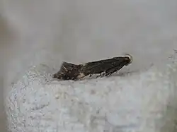 The wingspan is 10.8–13 mm.[2] Adults are on wing from May to August in one generation per year.[3] Palpi pale yellowish. Forewings dark purplish-fuscous; a triangular whitish-ochreous tornal spot, and another on costa beyond it. Hindwings grey. Larva pale whitish-green; head very pale brown; 2 with a grey plate and two black spots. Pupa in a flat case formed of a portion of the mined stem.[4] [5][6][7]