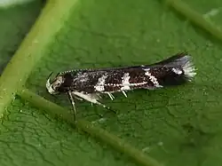 The wingspan is 8–10 mm. Head white. Antennae with apical third white. Forewings blackish; two bars from costa, at 1/4 and 1/2, a straight sometimes interrupted oblique fascia at 3/4, and an apical spot silvery-metallic; white spots in cilia on costal extremity of fascia and at apex. Hindwings pale grey. Larva light rosy; head pale brown; 2 brownish: in silken galleries.[3][4][5][6]