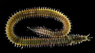 Eunicidae is a family of marine polychaetes (bristle worms). The family comprises marine annelids distributed in diverse benthic habitats across Oceania, Europe, South America, North America, Asia and Africa.[1] The Eunicid anatomy typically consists of a pair of appendages near the mouth (mandibles) and complex sets of muscular structures on the head (maxillae) in an eversible pharynx.[2] One of the most conspicuous of the eunicids is the giant, dark-purple, iridescent "Bobbit worm" (Eunice aphroditois), a bristle worm found at low tide under boulders on southern Australian shores. Its robust, muscular body can be as long as 2 m.[3] Eunicidae jaws are known from as far back as Ordovician sediments.[4][5] Cultural tradition surrounds Palola worm (Palola viridis) reproductive cycles in the South Pacific Islands.[6] Eunicidae are economically valuable as bait in both recreational and commercial fishing.[7][8] Commercial bait-farming of Eunicidae can have adverse ecological impacts.[9] Bait-farming can deplete worm and associated fauna population numbers,[10] damage local intertidal environments [11] and introduce alien species to local aquatic ecosystems.[12]