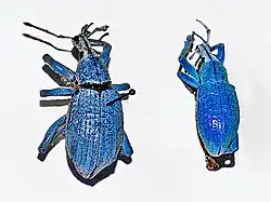 Eupholus azureus can reach a length of about 30 millimetres (1.2 in). This species is characterized by its cobalt blue colour, without speckles. There is a slight median longitudinal black line on the pronotum. The outer edge of the elytra and the edge of the pronotum are black. The elytra are pointed at the beetle's apex. The antennae are covered with sensory hairs.[2]