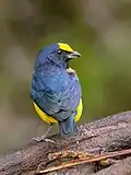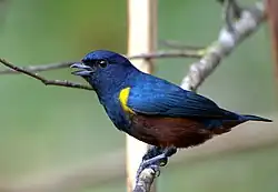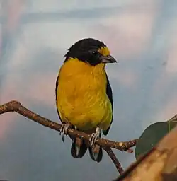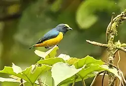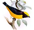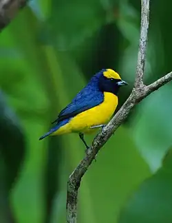 Euphonias were once considered members of the tanager family, Thraupidae.[3] A molecular phylogenetic study of the finch family Fringillidae published in 2012 included 9 species from the genus Euphonia and a single species from the genus Chlorophonia, the blue-naped chlorophonia. The resulting cladogram showed the blue-naped chlorophonia nested within the Euphonia clade implying that the genus Euphonia is paraphyletic.[4] The genus was introduced in 1806 by the French zoologist Anselme Gaëtan Desmarest in his Histoire naturelle des tangaras, des manakins et des todiers with the white-vented euphonia as the type species.[5][6]