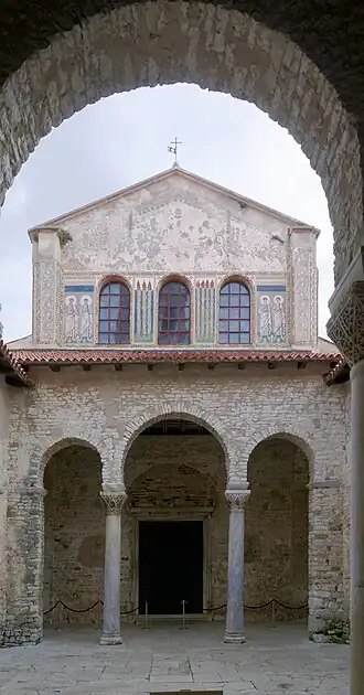 The Euphrasian Basilica (Croatian: Eufrazijeva bazilika, Italian: Basilica Eufrasiana) or the Cathedral Basilica of the Assumption of Mary is a Roman Catholic basilica in the Istrian town of Poreč, Croatia. The episcopal complex, which comprises the basilica itself, a sacristy, a baptistery and the bell tower of the nearby archbishop's palace, is an excellent example of early Byzantine architecture in the Mediterranean region.