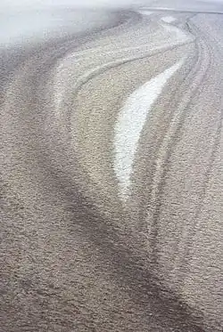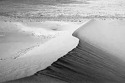 The Eureka Valley Sand Dunes are located in the southern part of Eureka Valley. Although covering an area of only 3 square miles (7.8 km2), the dunes rise approximately 680 feet (210 m) above the surrounding valley floor, making them one of the highest dune fields in North America.[1] Eureka Valley is a basin and range structural valley oriented northwest–southeast and enclosed by the Last Chance Range to the east and the Saline Range to the west. The Eureka Dunes themselves are located in the southeasternmost tip of the valley and trend north–south, parallel to Last Chance Range. According to a USGS survey map, the surrounding mountain ranges contain rocks that date back to the Mississippian and Cambrian periods while the surficial deposits on the valley floor are made up mainly of alluvium dating to the Quaternary period.[2] They are also classified as booming sand dunes, one of only about forty worldwide.[3]