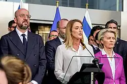 European Union: President of the European Commission Ursula von der Leyen said she "unequivocally" condemned "the attack carried out by Hamas terrorists against Israel", calling it "terrorism in its most despicable form" and saying "Israel has the right to defend itself against such heinous attacks".[33][34] EU ambassador to Israel Dimiter Tzantchev condemned the attack.[35] Israeli flags were raised outside the headquarters of the European Commission and the European Parliament in Brussels, while the latter's president Roberta Metsola led a vigil in the chamber on 11 October to commemorate the Israeli victims of the attack which also featured a minute's silence and a rendition of the Israeli national anthem. The European Council issued a joint statement of 15 October, condemning "in the strongest possible terms" Hamas and its brutal and indiscriminate terrorist attacks.[36]