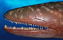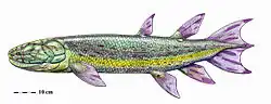 Eusthenopteron (from Greek: εὖσθένος eûsthénos 'stout', and Greek: πτερόν pteron 'wing' or 'fin')[2][1] is an extinct genus of prehistoric marine lobe-finned fish known from several species that lived during the Late Devonian period, about 385 million years ago. It has attained an iconic status from its close relationship to tetrapods. Early depictions of animals of this genus show them emerging onto land, but paleontologists now think that Eusthenopteron species were strictly aquatic animals, though this is not completely known.[3]