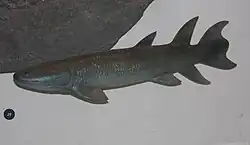 Like other fish-like sarcopterygians, Eusthenopteron possessed a two-part cranium, which hinged at mid-length along an intracranial joint. Eusthenopteron's notoriety comes from the pattern of its fin endoskeleton, which bears a distinct humerus, ulna, and radius in the fore-fin and femur, tibia, and fibula in the pelvic fin. These appendicular long bones had epiphyseal growth plates that allowed substantial longitudinal growth through endochondral ossification, as in tetrapod long bones.[16] These six appendicular bones also occur in tetrapods and are a synapomorphy of a large clade of sarcopterygians, possibly Tetrapodomorpha (the humerus and femur are present in all sarcopterygians). Similarly, its elasmoid scales lack superficial odontodes composed of dentine and enamel; this loss appears to be a synapomorphy with more crownward tetrapodomorphs.[17] Eusthenopteron differs significantly from some later Carboniferous tetrapods in the apparent absence of a recognized larval stage and a definitive metamorphosis.[12] In even the smallest known specimen of Eusthenopteron foordi, with a length of 29 millimetres (1.1 in), the lepidotrichia cover all of the fins, which does not happen until after metamorphosis in genera like Polydon (the American paddlefish). This might indicate that Eusthenopteron developed directly, with the hatchling already attaining the adult's general body form (Cote et al., 2002).