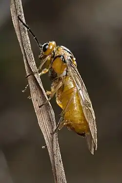 Euura is a genus of sawflies of the family Tenthredinidae, subfamily Nematinae. Some of the larvae feed externally on plants and some form plant galls on willows (Salix species).[1] In the case of the gall-forming species, when the female lays her eggs she injects a stimulant and the gall starts to form before the eggs hatch. Most sawfly galls are hard and individual larva tend to inhabit the gall, feeding on the tissue and leave the gall to pupate in the soil.[2] Most of the species are monophages (i.e., specific to one species of willow) although the type species, Euura mucronata, is polyphagous feeding on over thirty species of willow.[3]