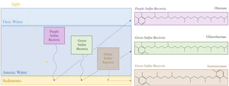 Bacteria such as green sulfur bacteria and purple sulfur bacteria, which exist where the photic zone overlaps with euxinic water masses, leave pigments behind in sediments. These pigments can be used to identify past euxinic conditions.[1] The pigments used to identify past presence of green sulfur bacteria are chlorobactane and isorenieratene.[25] The pigments used to identify past presence of purple sulfur bacteria is okenane.[26]