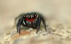 Evarcha ignea is a small spider.[13] The spider's body is divided into two main parts: a rectangular, slightly rounded cephalothorax and larger ovoid abdomen that is narrower to the rear.[14] The male has a carapace, the hard upper part of the cephalothorax,[15] that is between 1.9 and 2.3 mm (0.07 and 0.09 in) long and 1.5 and 1.8 mm (0.06 and 0.07 in) wide. It is generally dark brown with a brown streak down the middle and a thin black line at the edges. The eye field is black.[13] There is a patch of white hairs at the back of the eye field, with more scattered on the carapace, and long brown hairs close to the eyes themselves. There are orange scales near some of the eyes. The underside of the cephalothorax, or sternum, is yellow, with a tint of grey. The clypeus is high and covered in bright scarlet scale-like hairs, the brightness of which give the spider its name. The spider's mouthparts, including the labium, are generally brown. The chelicerae have a single tooth.[16]