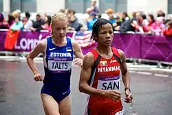 ![]() Evelin Talts (left) with Ni Lar San at the Women's marathon in London 2012. | |