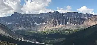 Evelyn Peak is a 2,855 m (9,367 ft) mountain summit in the Athabasca River valley of Jasper National Park, in the Canadian Rockies of Alberta, Canada. THe nearest higher peak is Mount Kerkeslin, 5.0 km (3.1 mi) to the southwest, and Mount Hardisty is 6.0 km (3.7 mi) to the northwest.[1] All three are part of the Maligne Range. Evelyn Peak is composed of sedimentary rock laid down during the Cambrian period and pushed east and over the top of younger rock during the Laramide orogeny.[3] The mountain is at the headwaters of Evelyn Creek,[4] and three kilometres south of Evelyn Pass.[5] The creek and pass were named in 1921 for Evelyn Cavendish, Duchess of Devonshire (1870–1960), who visited nearby Maligne Lake in 1920.[6] The mountain's name however, has not yet been officially adopted by the Geographical Names Board of Canada.