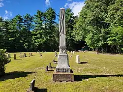 The white-marble Chidsey obelisk is one of the chief objects of historical interest. A common form derived from Egyptian practice, the obelisk was used throughout the 19th century to mark the plots of well-to-do families. The Chidsey obelisk is especially notable for its high level of stone-carving artistry, featuring a draped shroud (a symbol of mourning), tassels, and a wreath (a symbol of victory through the Resurrection).[2]