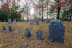 Evergreen Cemetery is located in south central Medway, occupying about 13 acres (5.3 ha) bounded on the north by Evergreen Street and the east by Cottage Street. The principal drive through the cemetery runs north–south through the center, roughly paralleling a brook that ends in a pond near the center of the cemetery. The brook separates the oldest portion of the cemetery (on its west side) from most of its later sections. The oldest portion is located on a small hill, with mainly slate grave markers. The later eastern section is generally flat and subdivided into rectangular grids. The newest section is located south of the oldest, accessed via a causeway crossing the southern part of the pond.[2]