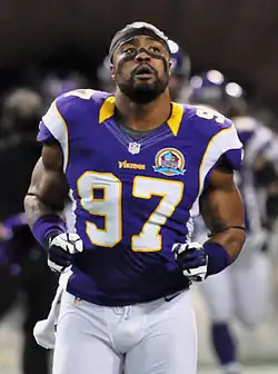 Everson Griffen (born December 22, 1987) is an American former professional football player who was a defensive end in the National Football League (NFL). A graduate of Agua Fria High School, Griffen played college football for the USC Trojans.[1] He was selected by the Minnesota Vikings in the fourth round of the 2010 NFL draft and played for them for 10 seasons before signing with the Dallas Cowboys in 2020. He was traded to the Detroit Lions later that year, then re-signed with the Vikings in August 2021.