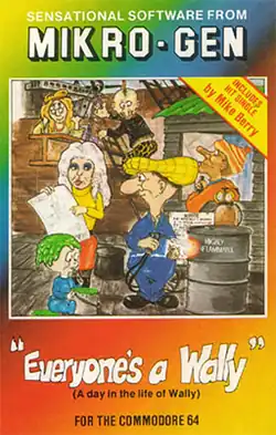Everyone's a Wally was the first arcade adventure game to feature multiple playable characters: Wally Week (a builder and handyman), Wilma (his wife), Tom (a punk mechanic), Dick (a plumber) and Harry (a hippie electrician).[2] Herbert, the baby son of Wally and Wilma, appeared in the game as a mobile hazard NPC. The player can change character when in the same location as another - those not being controlled wander around the village carrying on their own chores and business. The character switch and the chores attendance simulation were original at the time. The energy ("endurance") of each character is decreased when in contact with NPCs; the game ends if characters deplete their energy.
