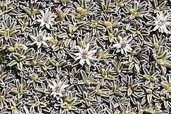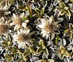The close branching of shoots, short internodes and tightly packed stems cause the characteristic hemispherical shape of a cushion plant species.[2][3] It can spread approximately 1 metre in diameter with its adventitious roots forming at various points along the prostrate branches.[1][4] The leaves are silver grey in colour with rust-coloured hairs.[4] In shape, the leaves are broadly oval and approximately 10mm long.[4] At the ends of the branches, small, white, papery flower heads occur in summer.[1][4] This morphology allows this species to be very frost tolerant.[1]