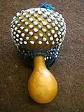 The next instrument used in traditional Ewe drumming is called axatse (pronounced ah-hah-chay). The axatse is a rattle-like instrument made from a hollowed-out gourd covered with a net of seeds or beads. The axatse is usually played sitting down. It is held at the handle and in the players strong hand and is shaken up hitting the hand and down hitting the thigh making two different sounds. The axatse usually plays the same thing that the bell plays but with some extra added notes in between the beats. It can be described as the eighth note version of what the gankogui plays. It has also been described as enriching or reinforcing what the gankogui plays. Overall it gives energy to the music and drives the music. The axatse produces a dry rattling but energetic sound.