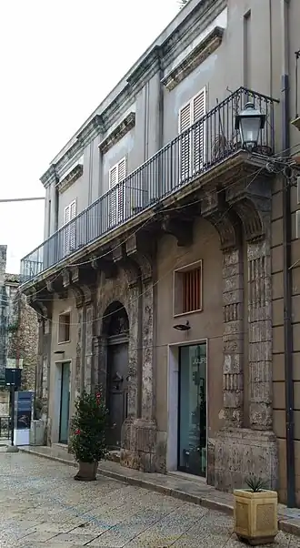 The façade is quite rich and imposing, with a high pedestal in shiny travertine[5] and lesenes ending with fluted corbels; the main door is located in Corso 6 Aprile: there is a round arch made with ashlars. In addition, in via Barone san Giuseppe there are four entrances on the ground floor and three balconies with stone galleries.[2] In the Corso there is also a big balcony with wrought iron and three entries.