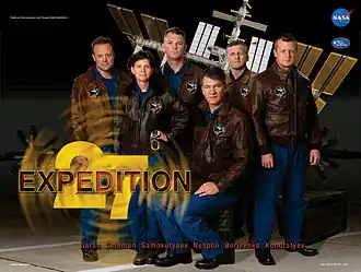 ![]() Expedition 27 mission patch ![]() (l-r) Garan, Nespoli, Samokutyayev, Coleman, Borisenko and Kondratyev | |