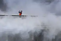 Along the publicly accessible bridge connecting Piers 15 and 17, artist Fujiko Nakaya created an installation called Fog Bridge #72494 that creates bursts of fog for six minutes every half-hour as the first in a series of large-scale temporary installations called Over the Water.[48] The Fog Bridge is 150 feet (46 m) long and makes use of 800 nozzles to create the fog, which Nakaya hopes will inspire visitors to pay attention to the nature of one of San Francisco’s best-known weather patterns. Although originally slated to be temporary, it is now on permanent display. A desalination system, located in Pier 17, conditions bay water for use in the artwork.[49][50]