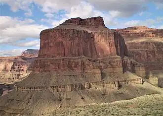 Explorers Monument is a 4,572-foot-elevation (1,394-meter) summit located in the Grand Canyon, in Coconino County of northern Arizona, US.[2] It is situated 3.5 miles due west of Mount Huethawali, within a meander of the Colorado River. It towers over 2,400 feet (730 meters) directly above the river, providing rafters a view of this landmark. Explorers Monument is topped by rock of the Pennsylvanian-Permian Supai Group which overlays cliff-forming Mississippian Redwall Limestone, which in turn overlays Cambrian Tonto Group.[3] According to the Köppen climate classification system, Explorers Monument is located in a cold semi-arid climate zone.[4]